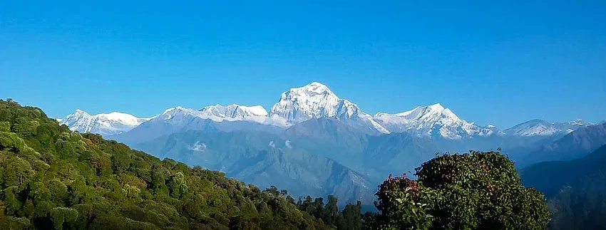The trail continues through lush forests of oak and rhododendron, passing streams and scenic rest stops. As you gain altitude, you’ll be rewarded with occasional views of Annapurna South and Hiunchuli peeking through the trees.